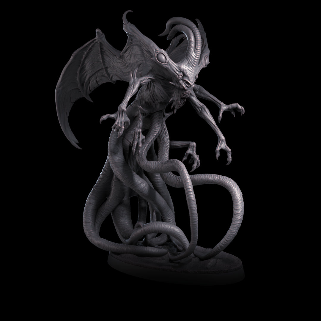 Imagine creatures ripped from the darkest corners of a nightmare—these warlocks loom large, their forms a sickening blend of human and cephalopod. Leathery wings unfurl like the shadows of forgotten horrors, casting eerie silhouettes against the damp stone walls of their lairs. Tentacles writhe beneath their bloated torsos Their heads, crowned with an array of eyes, glint with a sinister intelligence. Their skin is a pallid and scarred tapestry that shimmers with the remnants of amphibious past.