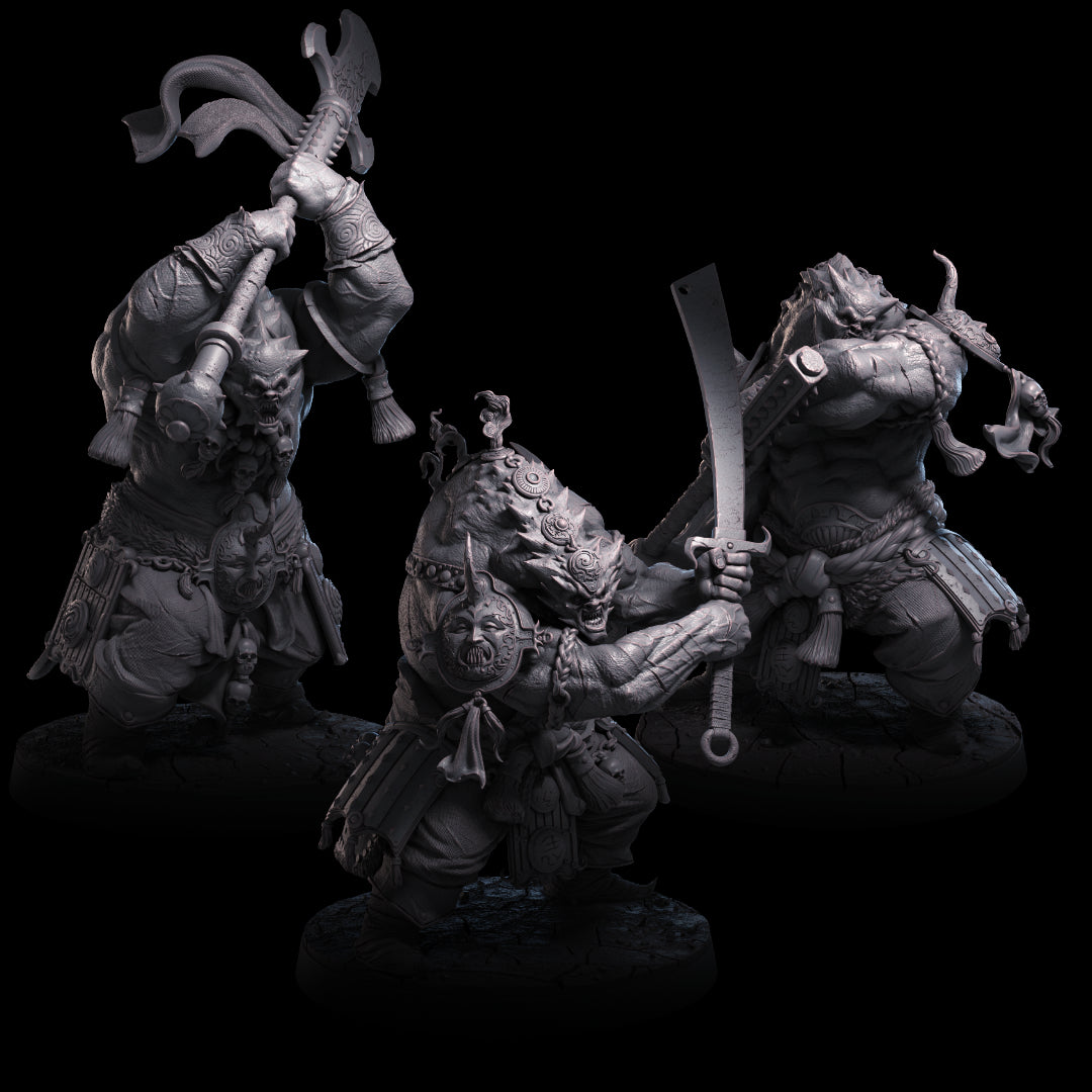 Nengori Ogres are the hulking, relentless enforcers of the Emperor of Neng, bound to his will by a fierce loyalty that rivals their immense physical strength. Towering over most foes, these brutal warriors are a terrifying presence on the battlefield, their mottled grey skin etched with scars and adorned with intricate tribal tattoos that chronicle their violent triumphs and unwavering service. Each mark on their flesh is a testament to their brutal efficiency and their place as symbols of the Emperor’s dominance.