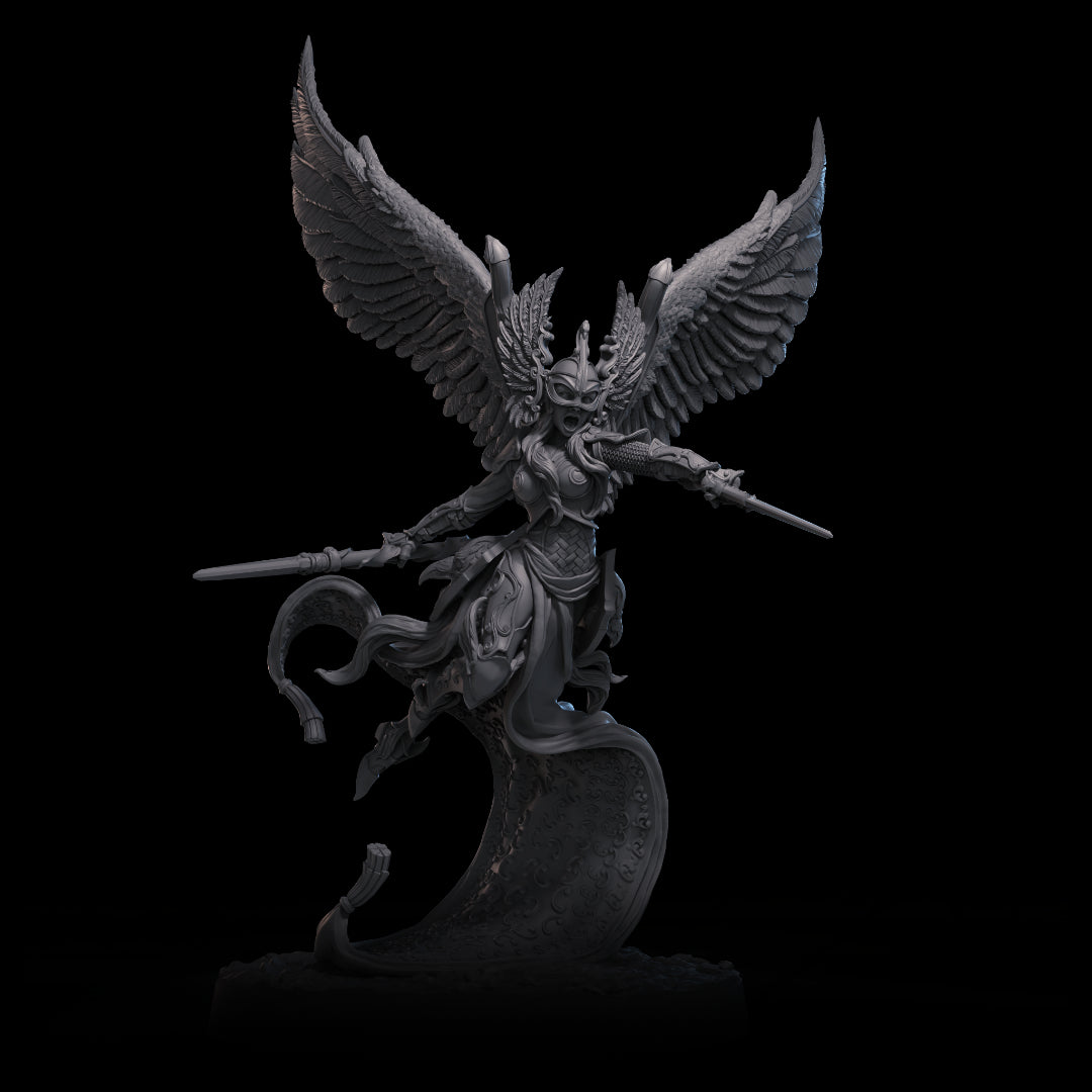Perhaps the most striking feature of Queen Brynhild is her wings. Sprouting from her back like the mighty wings of a raven, they unfurl to their full span, casting a shadow that seems to stretch on endlessly behind her. Their feathers shimmer with an otherworldly sheen, their black hue reminiscent of the darkest night sky.