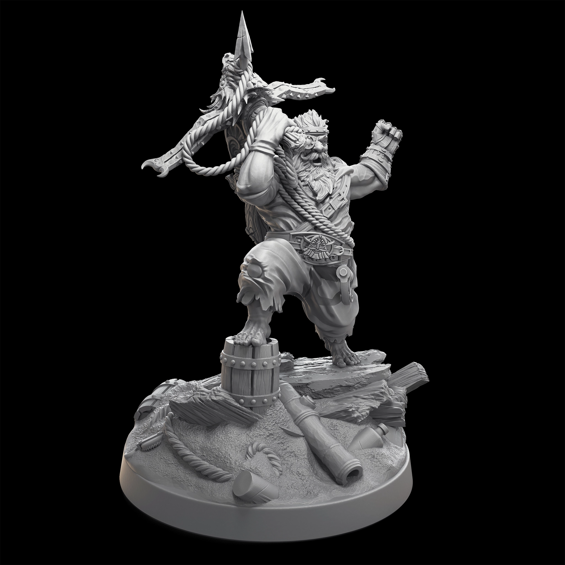 This intricately detailed miniature captures Zaffen in his element. Barefoot and rugged, with his giant crossbow slung over his shoulder, Zaffen's stance exudes confidence and readiness for the hunt. His muscular frame, adorned with practical sea-worn attire, and his focused expression peering through his eye-mounted crosshair, embody the spirit of a seasoned hunter. The crossbow, with its ornate design and sturdy rope, reflects both the artistry and brutality of his weapon of choice.