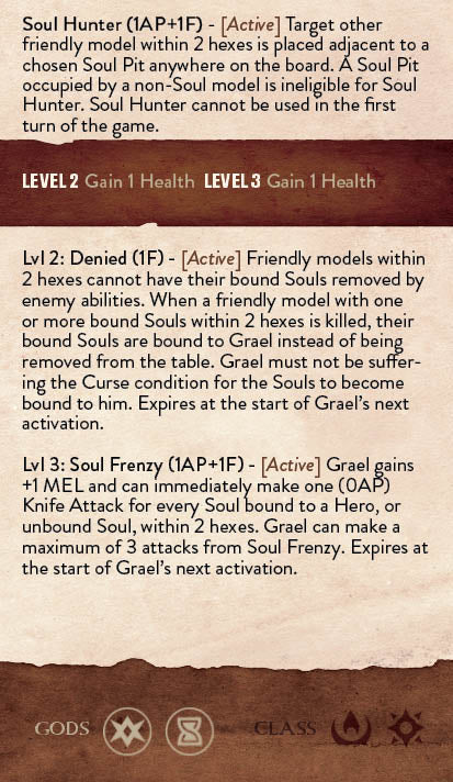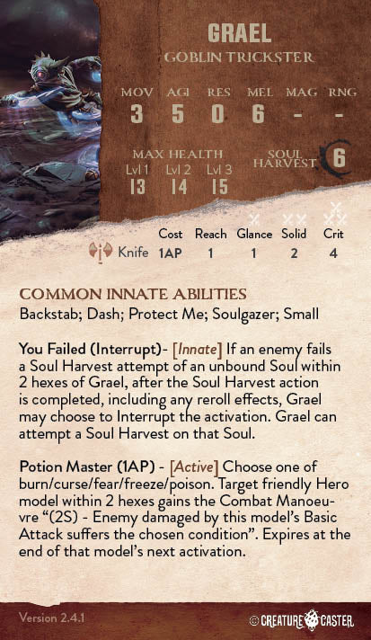 Few warriors fight for Souls as ruthlessly as Grael, the Goblin Trickster. Where others rely on brute force, Grael thrives on deception and mischief, securing Souls through cunning rather than direct confrontation. His Soulgazer abilities ensure that he can claim Souls from a safe distance, while his You Failed ability punishes enemies who dare to try and Soul Harvest before him. Every battle is a game to Grael, one where he is always looking for an opportunity to snatch victory from under his opponent’s nose.