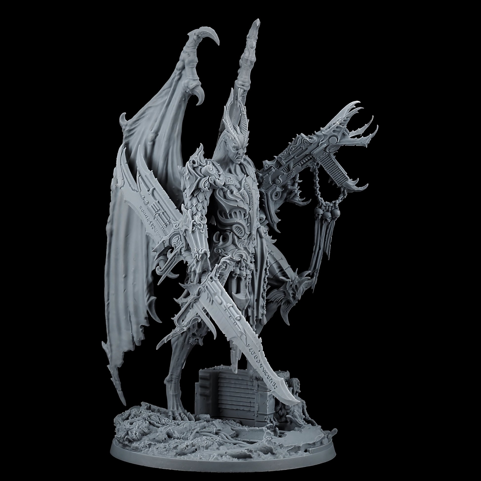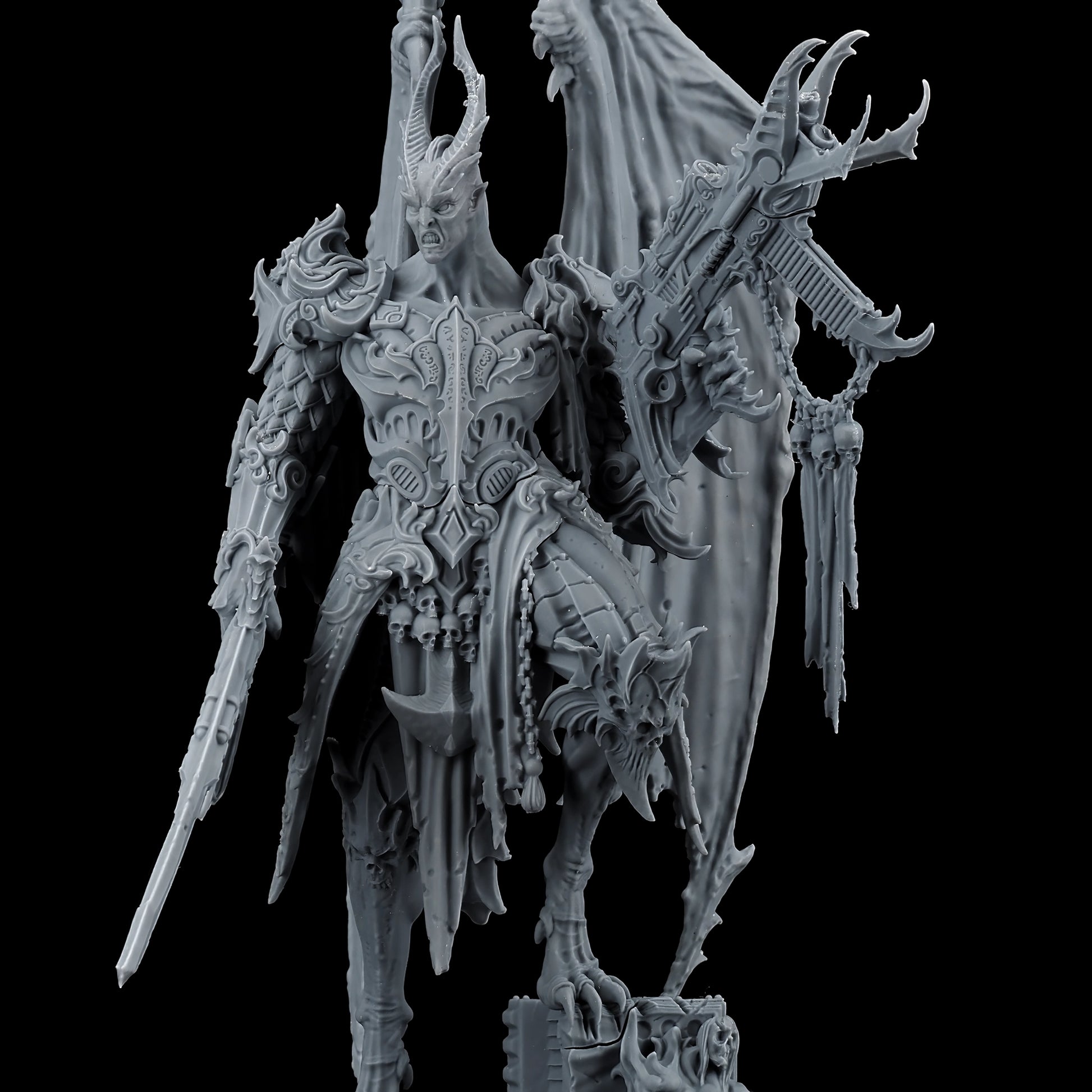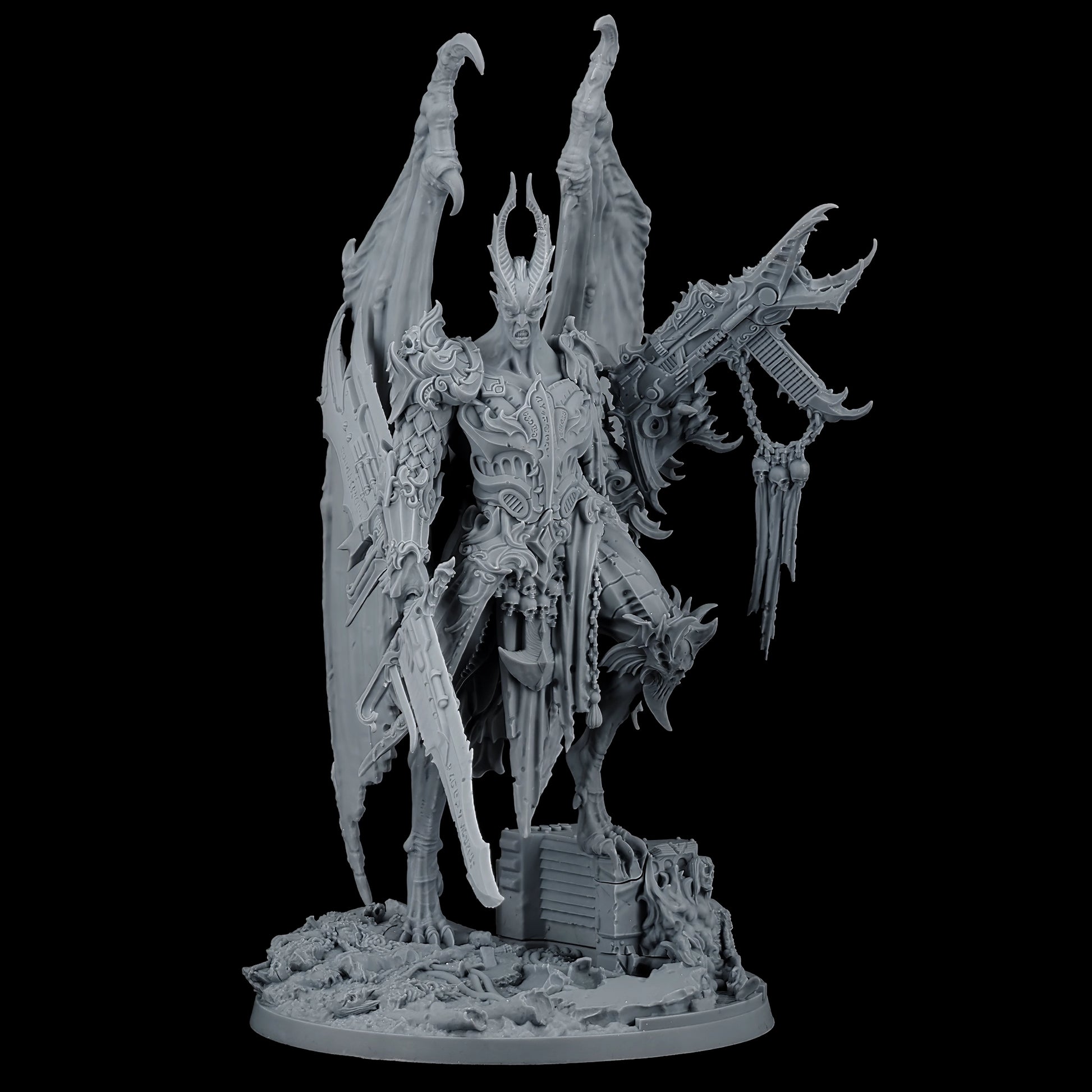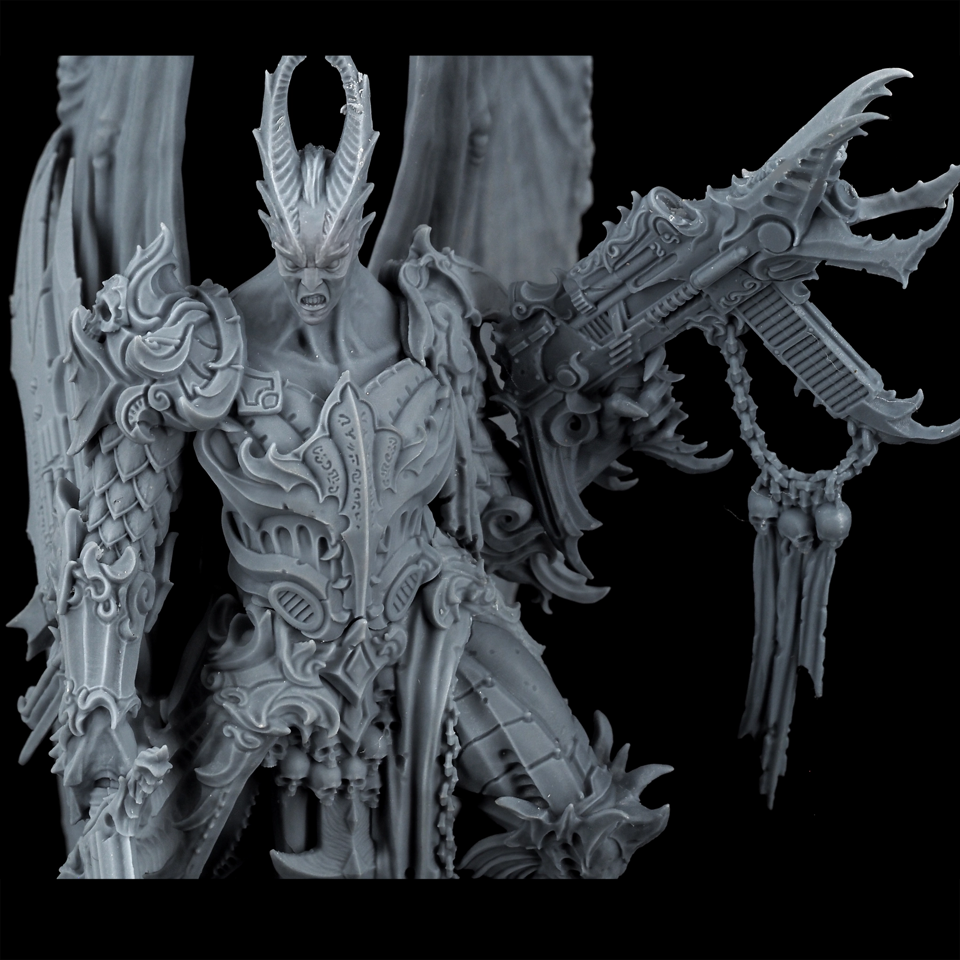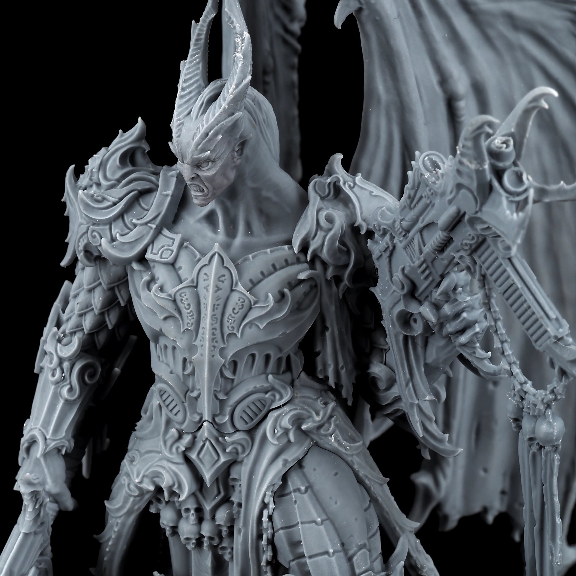 Encased in baroque armor, the Lord of Oppression is a fusion of organic and mechanical perfection. His formidable frame is adorned with intricate engravings and arcane symbols, reflecting the twisted craftsmanship of the Tyranny faction. With functional and symmetrical limbs, wings that stretch wide, and few signs of the grotesque mutations that plague his lesser kin, he is a paragon of their perverse ideal of beauty and power.