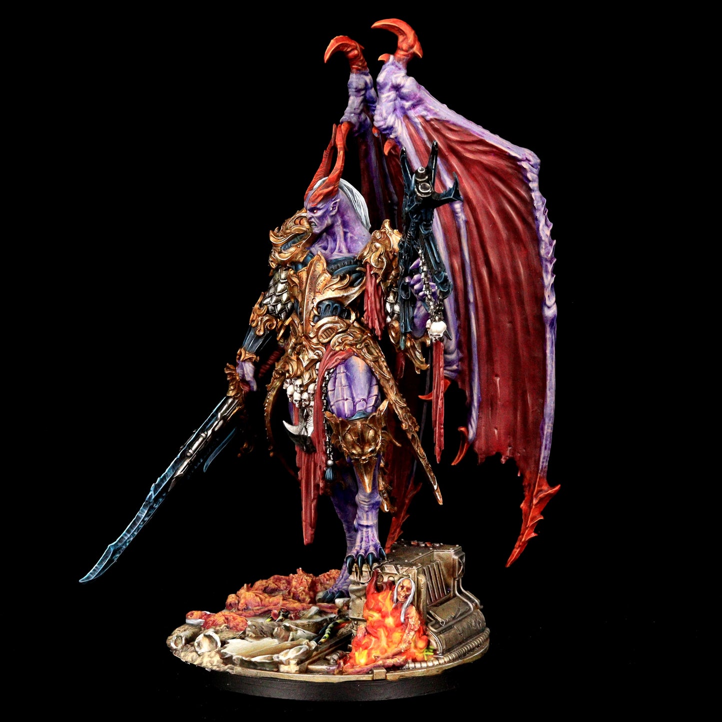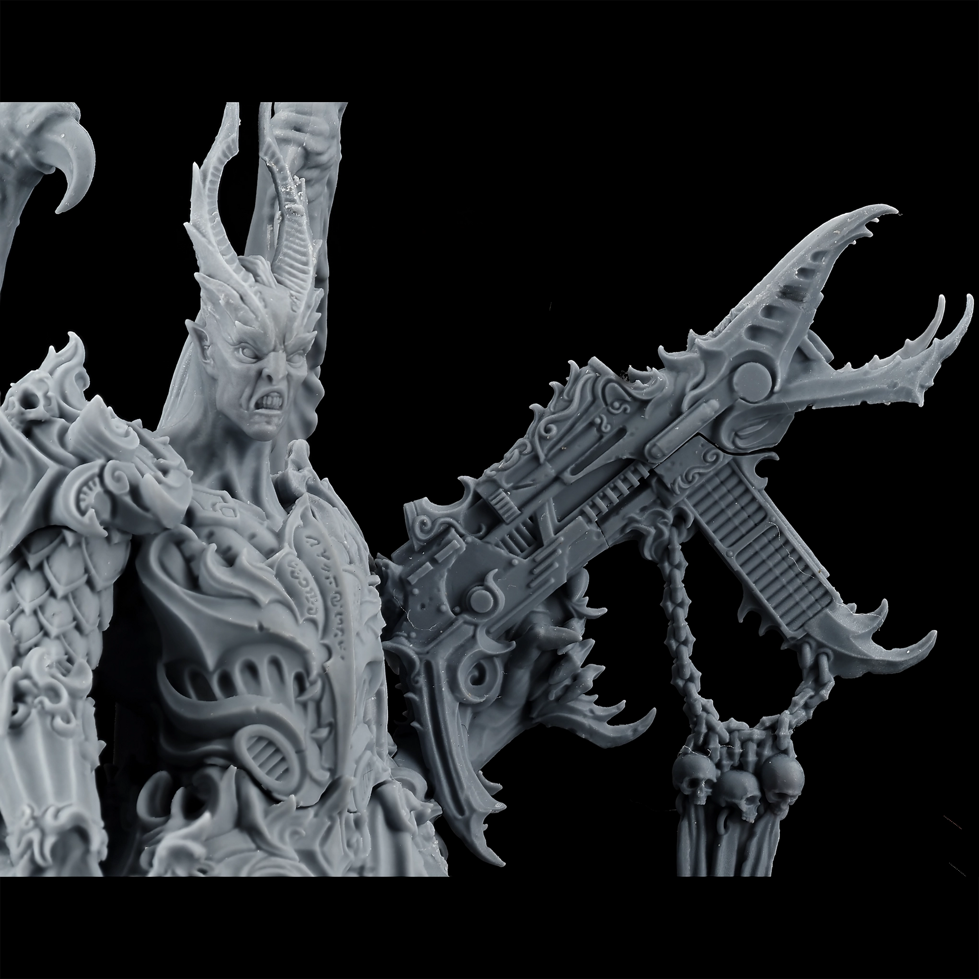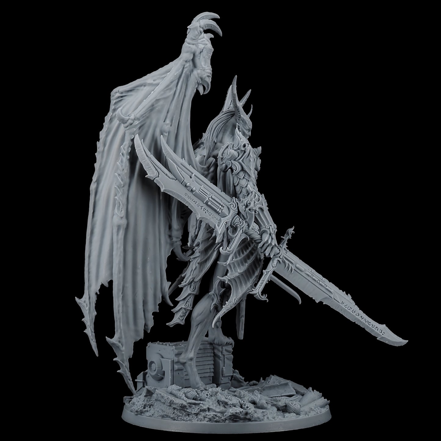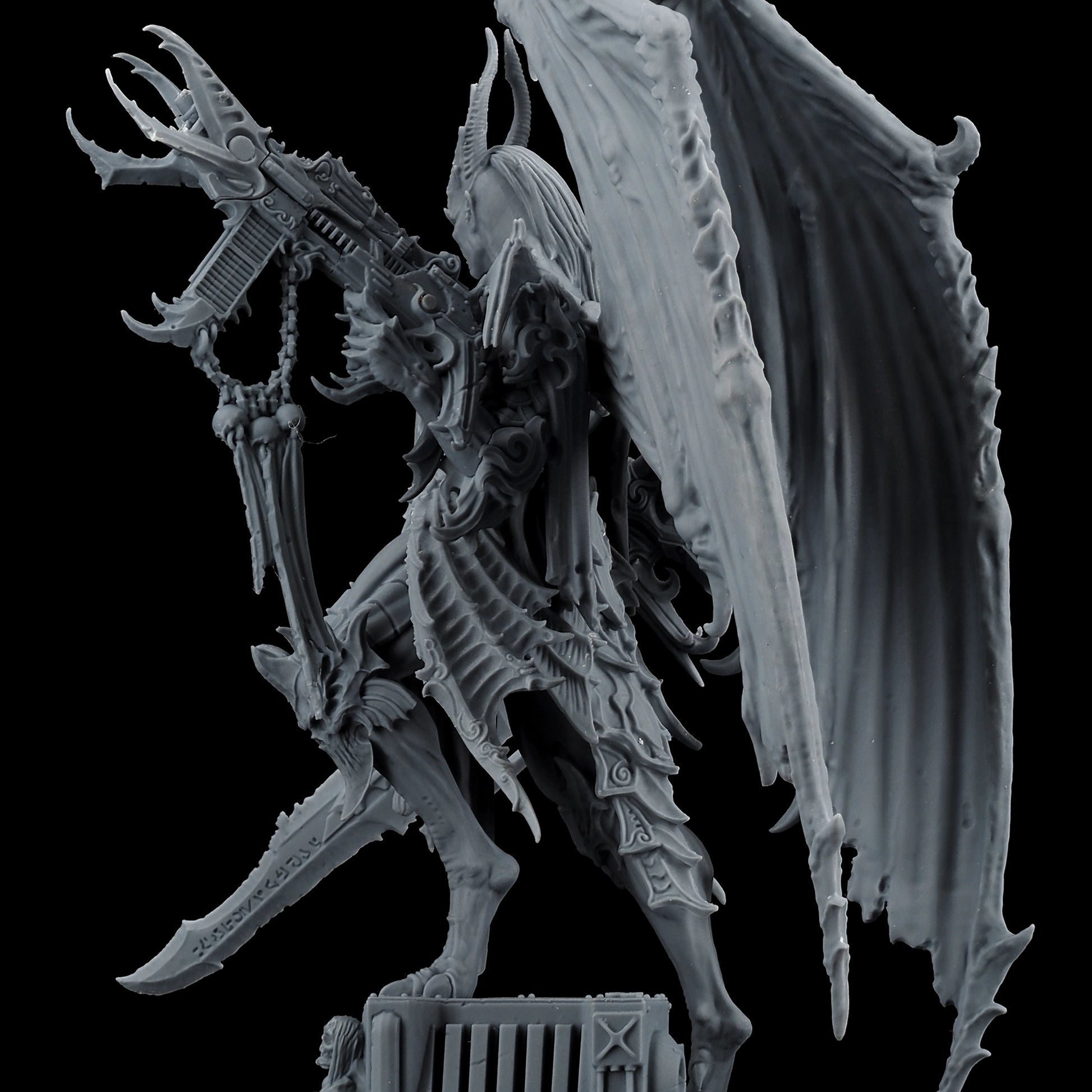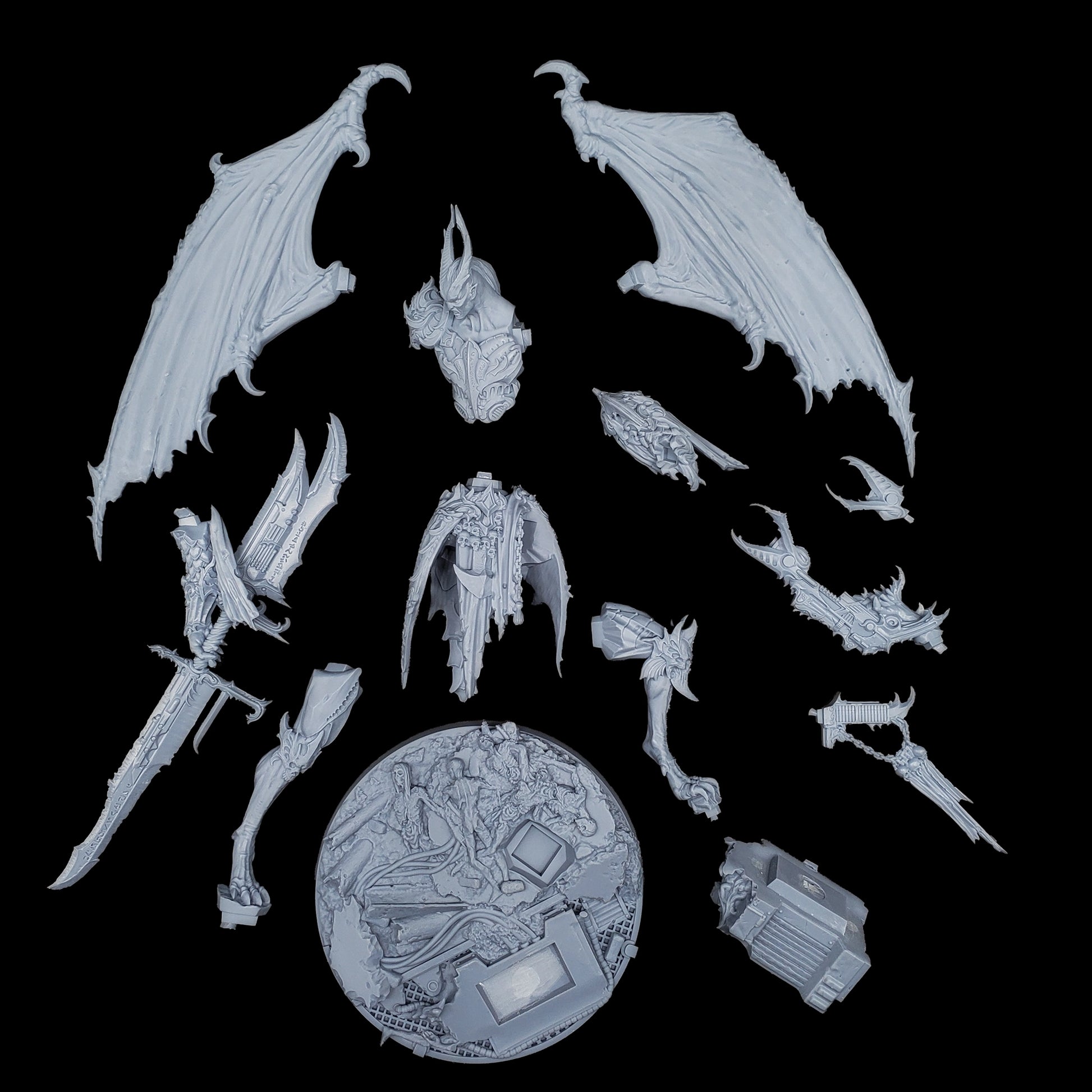 Encased in baroque armor, the Lord of Oppression is a fusion of organic and mechanical perfection. His formidable frame is adorned with intricate engravings and arcane symbols, reflecting the twisted craftsmanship of the Tyranny faction. With functional and symmetrical limbs, wings that stretch wide, and few signs of the grotesque mutations that plague his lesser kin, he is a paragon of their perverse ideal of beauty and power.