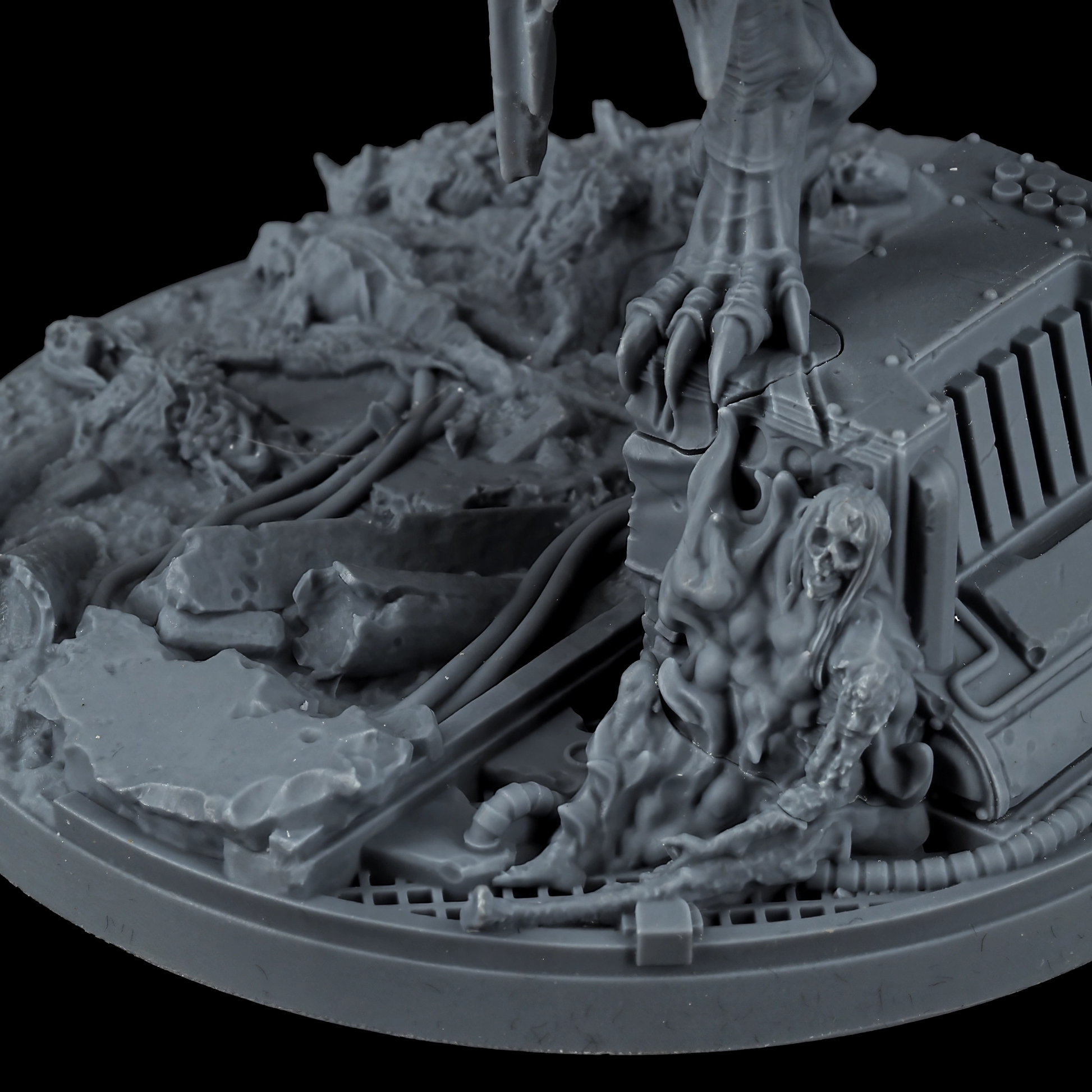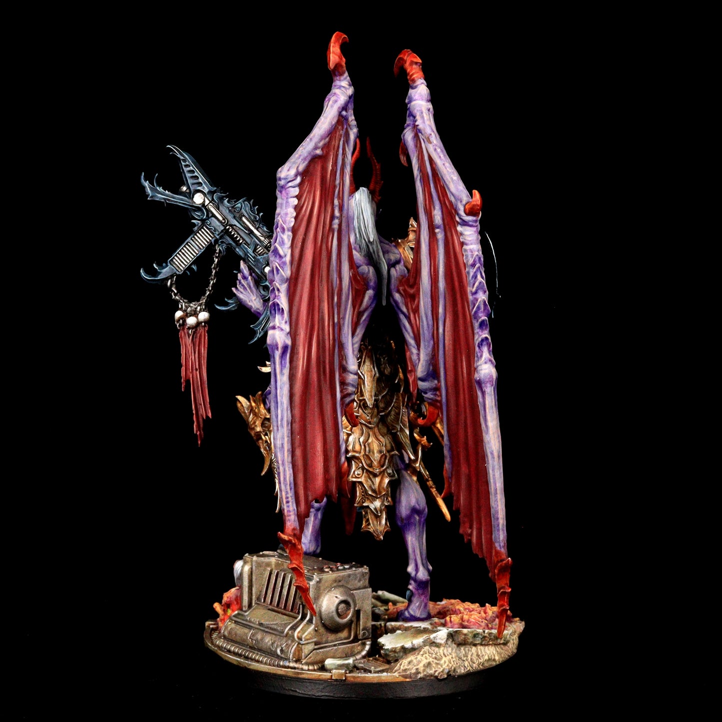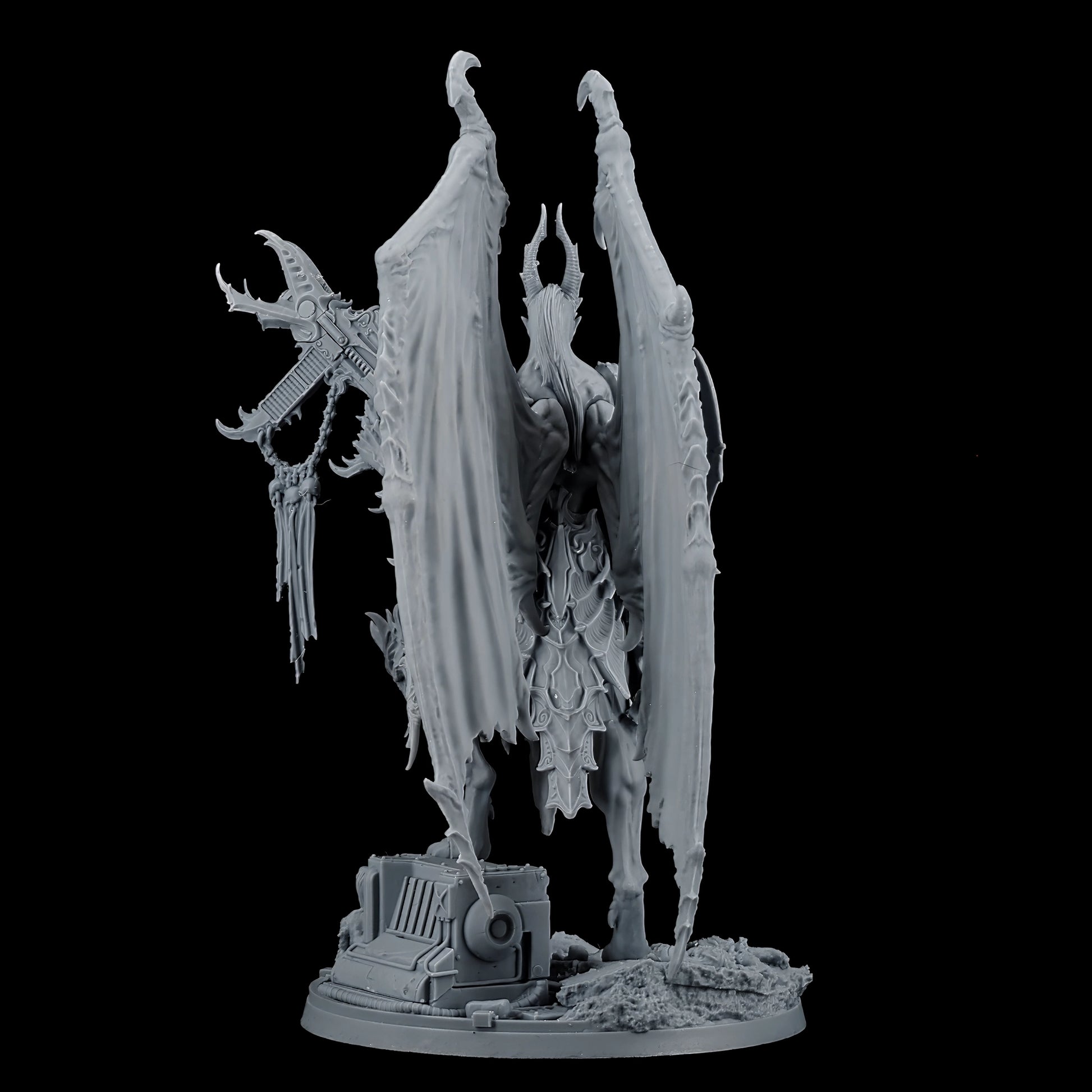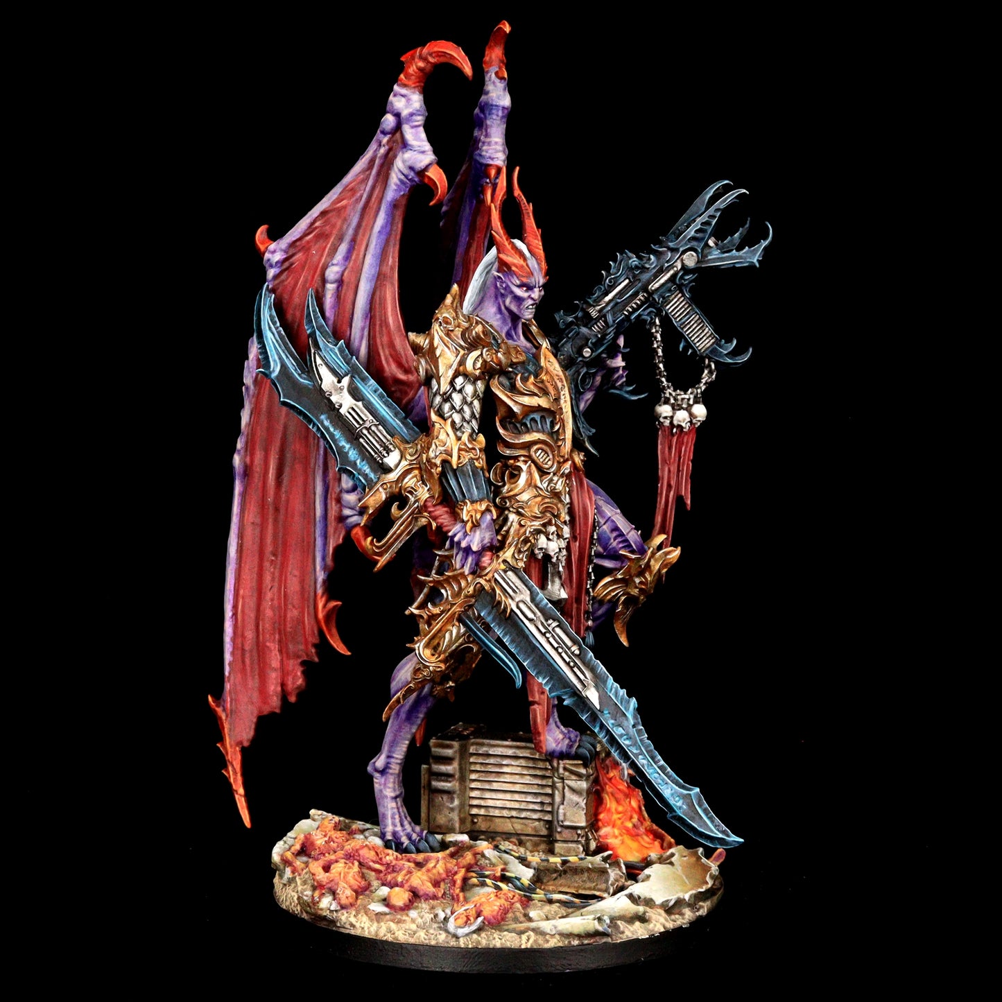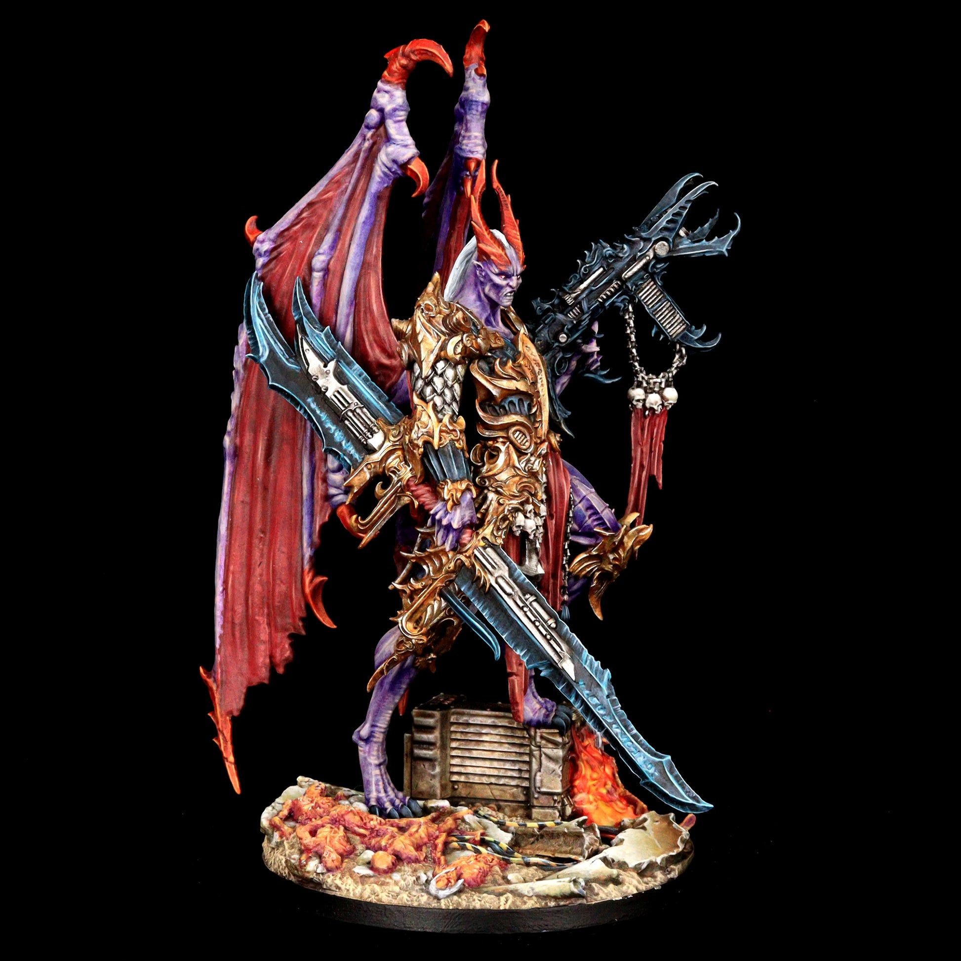 Encased in baroque armor, the Lord of Oppression is a fusion of organic and mechanical perfection. His formidable frame is adorned with intricate engravings and arcane symbols, reflecting the twisted craftsmanship of the Tyranny faction. With functional and symmetrical limbs, wings that stretch wide, and few signs of the grotesque mutations that plague his lesser kin, he is a paragon of their perverse ideal of beauty and power.