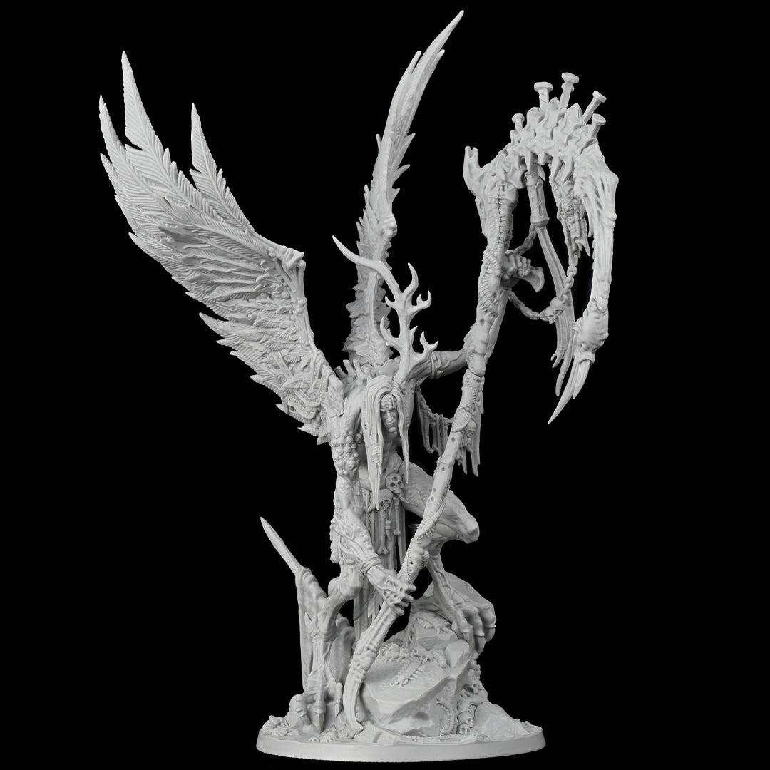 Plague Angels are an anomaly within the forces of Ruin. They are leaders, granted far more power than that of a simple Atriarch but far less than that of a Lord or Lady of Ruin. Thought it would be foolish for a more powerful creature to attempt to control them - as they are fearsome foes indeed. Their wings shudder in the wind, releasing dandruff of sickness and death - even as they cross the battlefield, they leave a miasma of palpable virulence. Their flesh is poison, and the blood that runs through their veins contains some of the most lethal pathogens known to mortals, and the creatures known as Yhtarii, alike - even being splattered with it after landing a successful blow can mean death for the victor later on
