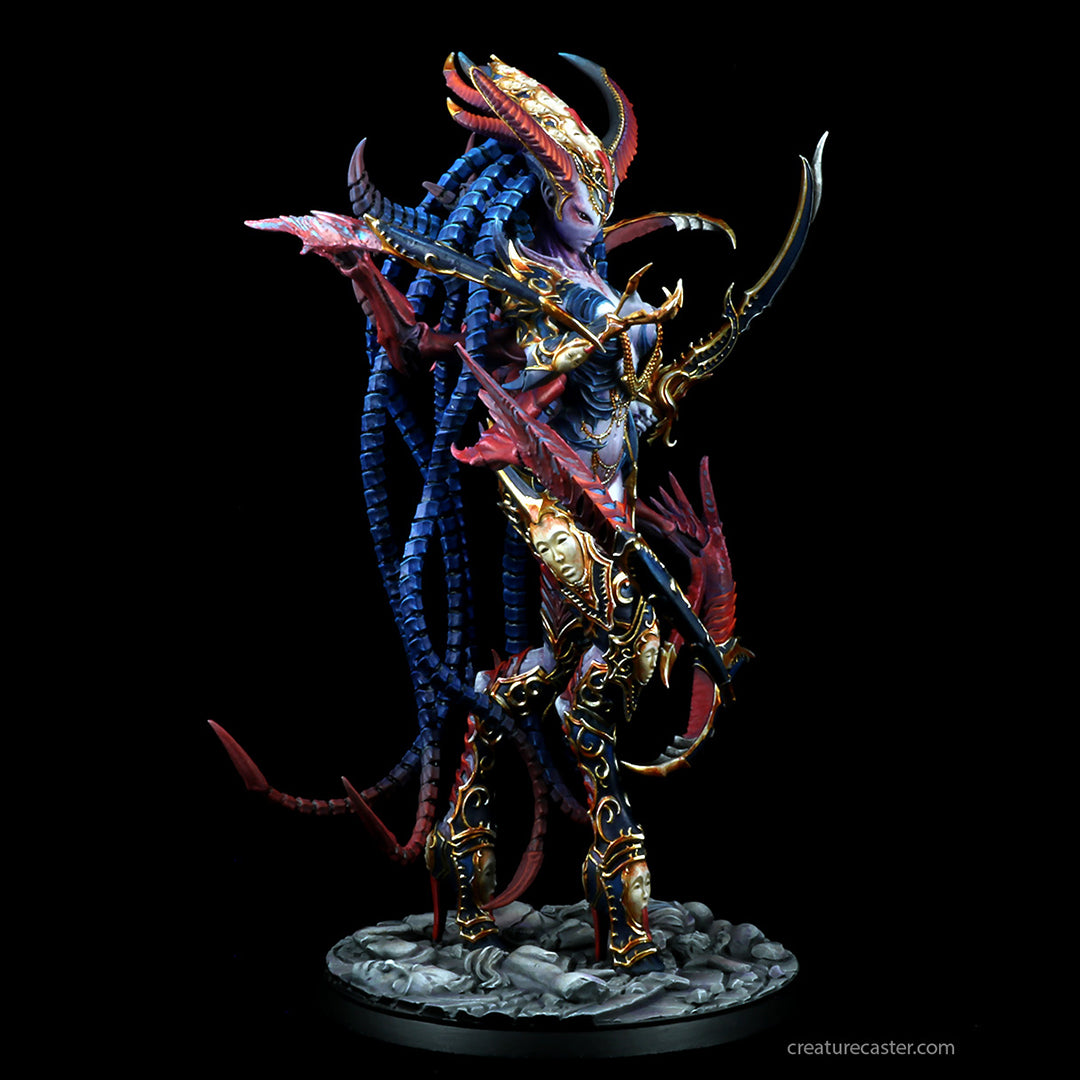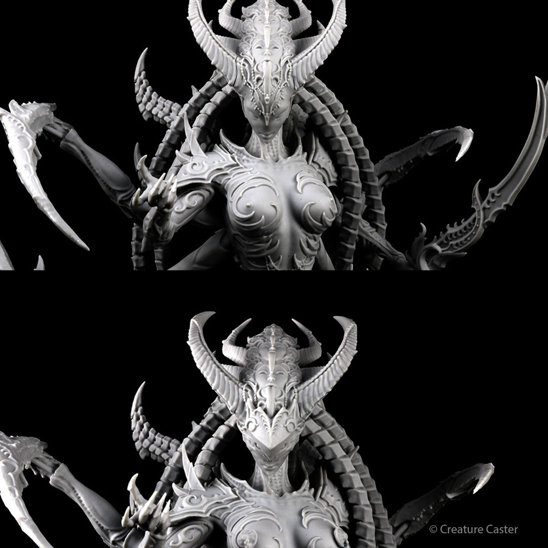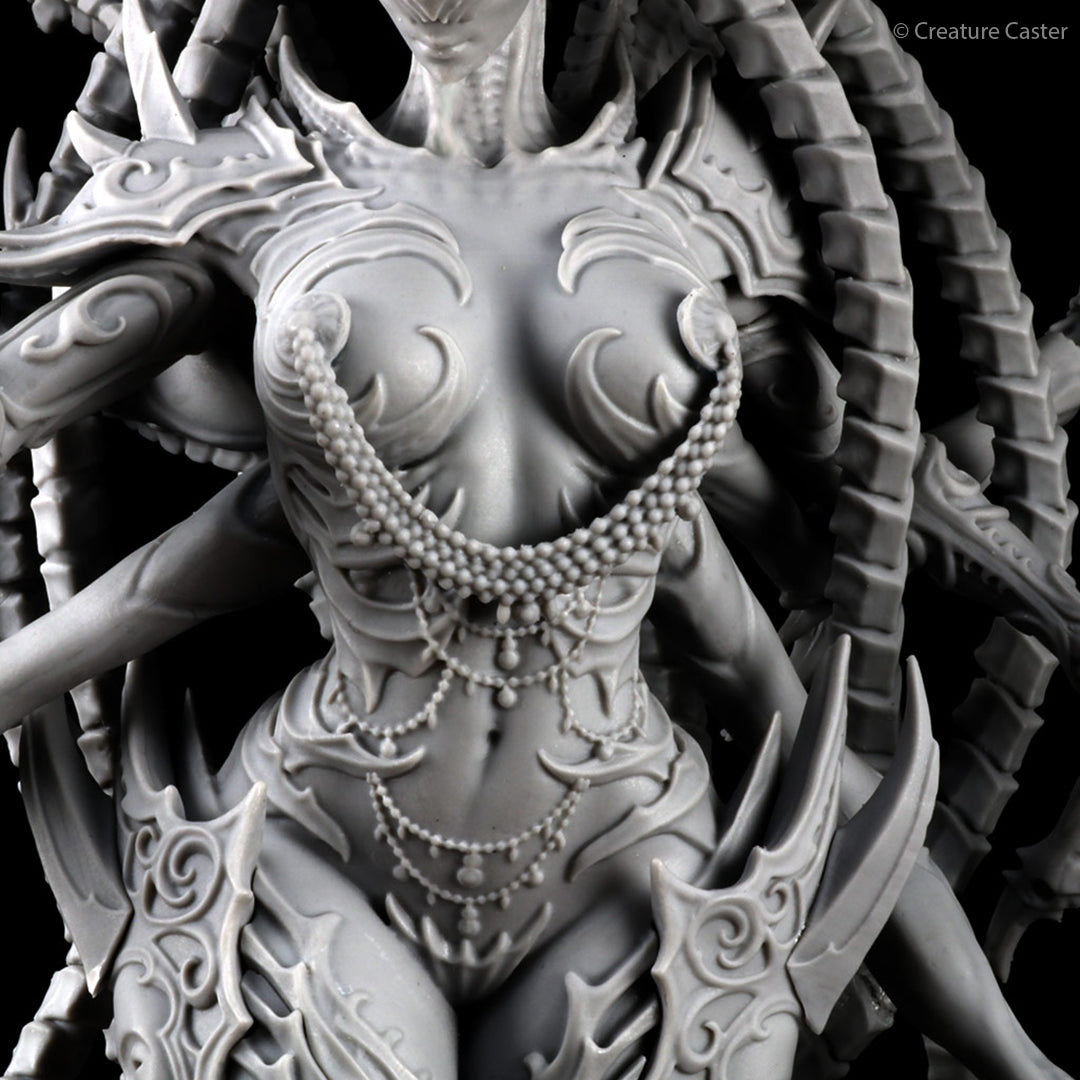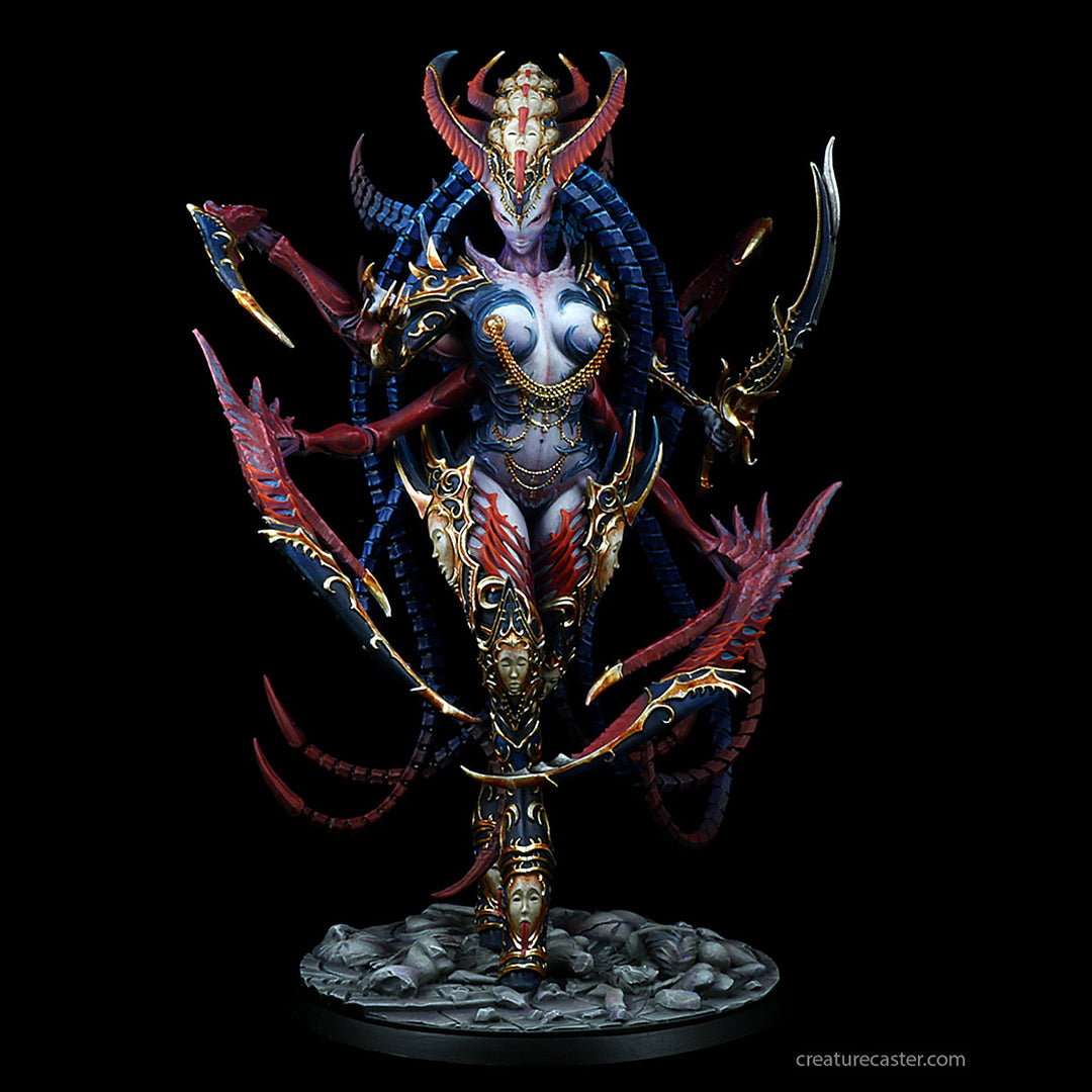 The first of the Creature Caster Queens glides alluringly onto the world’s stage. The Queens of Ecstasy are the most powerful embodiments of their faction. They command legions of lesser demons who are slavishly dedicated to them. The demons of Ecstasy, and those who have devoted themselves to their cause, exist in a state that is beyond mundane reality. They joyously partake in extreme acts of frenzied debauchery and excess. Their euphoria takes them beyond the bounds of reason, and they impulsively indulge in any act that takes their fancy. Their lives are endless orgies of sadomasochistic pleasures, and unrepentant desires.