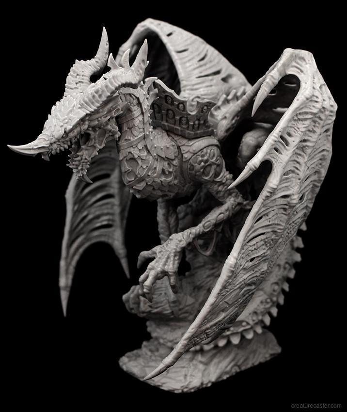 Zombie Dragon is cast in pure, unfilled, resin. He comes with a howdah, allowing you to use your own miniatures to represent the rider. Alternatively, he can be modeled with a saddle, or with a riderless option. The recess on his back can accommodate a 20mm by 20mm base.
