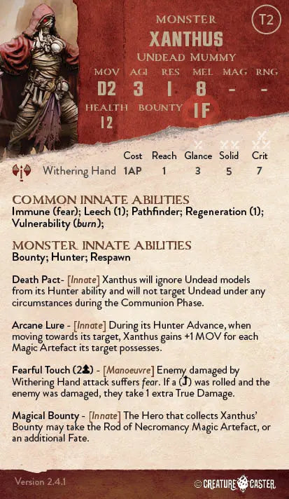 Ancient and embalmed in curses, Xanthus rises from his crypt to punish those who covet arcane power. Stalking the battlefield with unnatural purpose, he seeks out the strongest, most artifact-laden heroes and cuts them down with his devastating Withering Hand. Against well-equipped foes, he surges forward with surprising speed, empowered by their greed and his desire for arcane relics. His touch is ruinous—crippling limbs, shattering will, and sapping life with each swing.